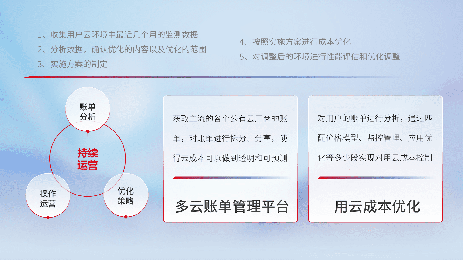 通过多云纳管,,以统一的资源数据模型把客户的云资源进行抽象和封装,,,,进而实现对多云资源的统一操作,,,,保障云资源管理的可靠性、、、稳定性与可用性。。。。量身定制化运维内容,,,配置、、、、开发运维、、、、补丁管理、、备份、、、、监控、、、、认证和访问管理、、、审计和日常巡检等,,,,保障在用云过程中的可靠度,,,稳定度以及高可用率。。。