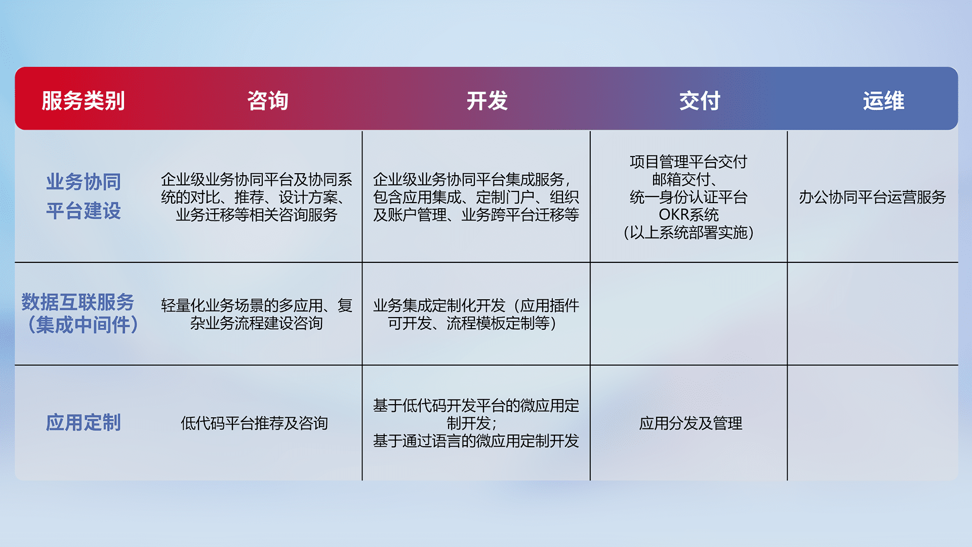 针对钉钉、、企微、、、IDaas等平台级产品提供产品的规划、、方案、、、、交付、、、定制化开发等服务,,,实现如统一协同办公、、智能客户服务、、、、混合会议管理、、、、智能数据查询、、、等业务场景,,,实现数字化转型。。